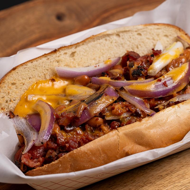 Scratch Made Charro Beans, Shredded Cheese and Bacon Bits.