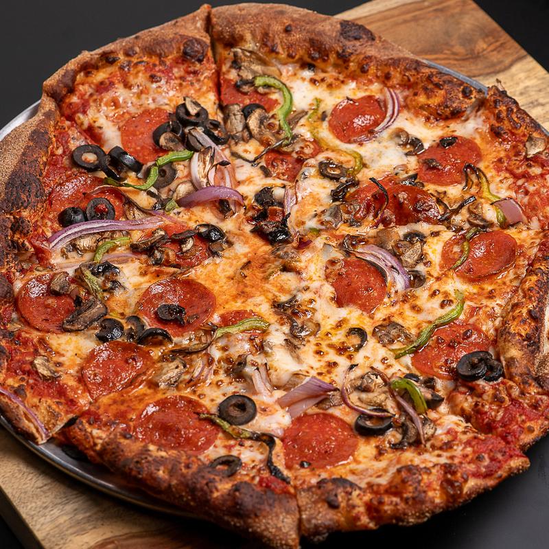 Pepperoni, Black Olives, Green Bell Peppers, Mushrooms, Red Onions.