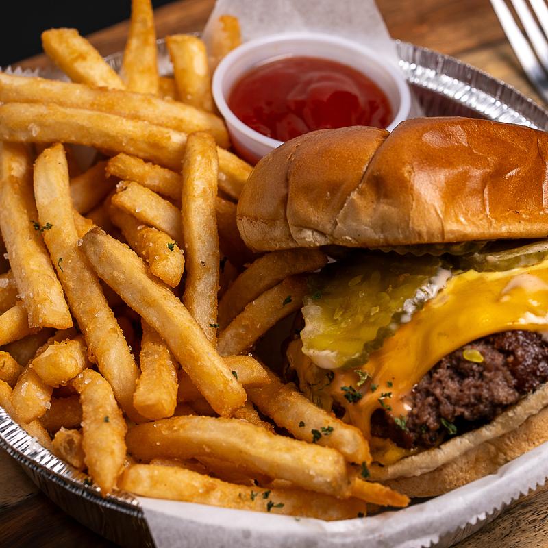 Smashed Patty Blanketed by Melty American Cheese Topped with Shredded Lettuce, Tomatoes and A Drizzle of Flips Sauce, Between a Buttery Brioche Bun.